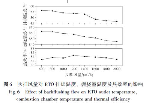 吹掃過程是通過吹掃風(fēng)機(jī)將殘留在蓄熱室內(nèi)的VOCs 帶入燃燒室, 以提高廢氣的效率[11] 。但目前RTO 反吹風(fēng)量的設(shè)計(jì)大多基于工程經(jīng)驗(yàn), 對(duì)不同工況下的實(shí)際運(yùn)行參考性不高。為了研究吹掃風(fēng)量對(duì)RTO 裝置運(yùn)行的影響, 試驗(yàn)設(shè)定在廢氣流量8000 m3 / h, 切換時(shí)間2 min 且無電加熱的條件下, 模擬吹掃風(fēng)量從600 m3 / h 增加到2000 m3 / h 時(shí)出口溫度、燃燒室溫度和熱效率變化情況。如圖6 所示。由于吹掃風(fēng)是從排至煙囪的煙氣中抽取, 實(shí)際吹掃風(fēng)中含有的VOCs 濃度較低, 無法給燃燒室提供多的。同時(shí), 過大的吹掃風(fēng)量增加了進(jìn)入進(jìn)氣和排氣蓄熱室的流量, 降低了實(shí)際發(fā)生氧化反應(yīng)的廢氣的預(yù)熱溫度, 且降低了出口溫度。雖然熱效率在1200 m3 / h 吹掃風(fēng)量附近有一定程度的增加, 但結(jié)合燃燒室溫度和經(jīng)濟(jì)因素,800 ~1000 m3 / h 區(qū)間內(nèi)較為合理與實(shí)際工程經(jīng)驗(yàn)吹掃風(fēng)量占進(jìn)氣流量的10% 左右結(jié)論相近[12] 。同時(shí)可以看出, 吹掃風(fēng)量越大, 燃燒室的溫度越低, 需要開啟電加熱器提供熱量來提高燃燒室的溫度, 增加運(yùn)行成本。